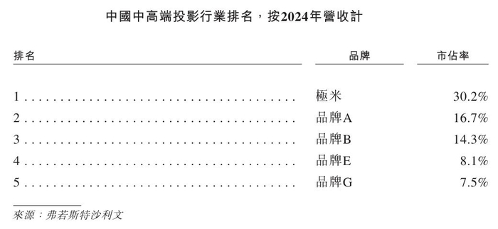 根据弗若斯特沙利文资料,自2018年起,极米科技连续七年蝉联中国投影行业销量第一;自2020年起连续五年保持国内营收冠军。在中国中高端投影行业,该公司2024年销量与营收均位列第一,按收入计算其市场份额约30.2%。