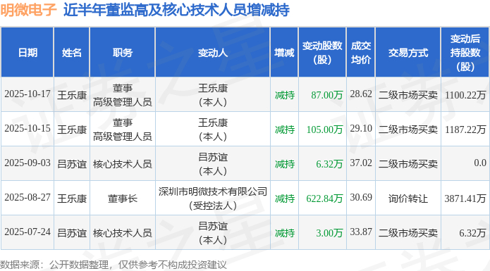证券之星消息,根据10月20日市场公开信息、上市公司公告及交易所披露数据整理,明微电子(688699)最新董监高及相关人员股份变动情况:2025年10月17日公司董事,高级管理人员王乐康共减持公司股份87.0万股,占公司总股本为0.7904%。变动期间公司股价下跌4.33%,10月17日当日收盘报34.22元。