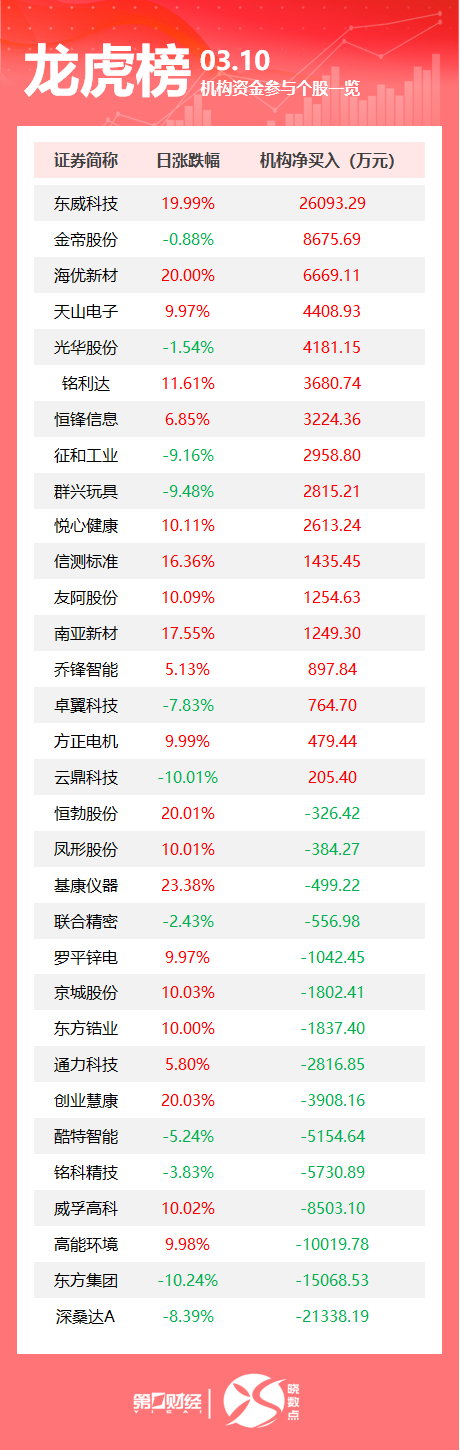 当天机构净买入前三的股票分别是东威科技、金帝股份、海优新材,净买入金额分别是2.61亿元、8676万元、6669万元。