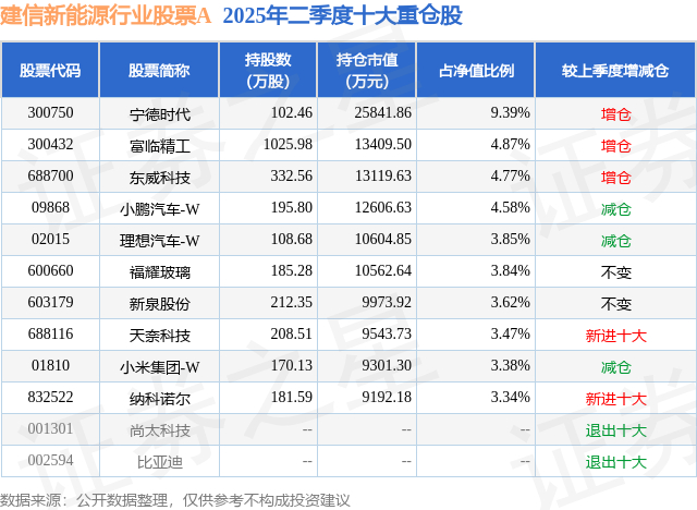 根据2025基金半年报公募基金重仓股数据,重仓该股的公募基金共42家,其中持有数量最多的公募基金为建信基金的建信新能源行业股票A。建信新能源行业股票A目前规模为25.86亿元,最新净值1.8521(9月25日),较上一交易日上涨1.25%,近一年上涨43.85%。该公募基金现任基金经理为陶灿 田元泉。陶灿在任的基金产品包括:建信改革红利股票A,管理时间为2014年5月14日至今,期间收益率为366.5%;建信高股息主题股票,管理时间为2020年1月21日至今,期间收益率为86.46%;建信兴润一年持有混合,管理时间为2021年8月24日至今,期间收益率为-23.13%。田元泉在任的基金产品包括:建信智能汽车股票,管理时间为2021年9月10日至今,期间收益率为-2.59%;建信研究精选混合A,管理时间为2024年6月12日至今,期间收益率为58.37%;建信稳定得利债券A,管理时间为2025年9月5日至今,期间收益率为0.87%。