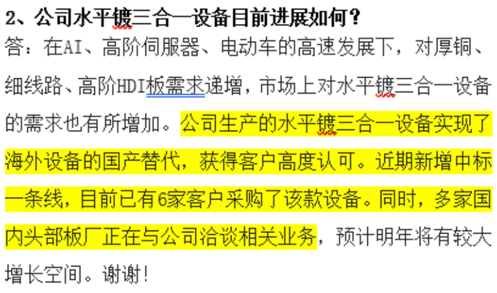 在高端HDI领域,过去一直被外资巨头垄断的水平电镀技术,现在东威科技也打破了封锁,其研发的“水平镀三合一”设备,已经实现了国产替代,目前已有6家客户采购,多家头部板厂正在洽谈合作,预计明年会有较大增长空间。