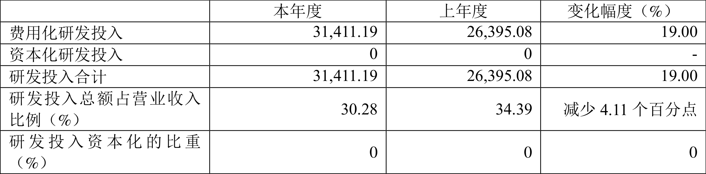 2023年全年,公司研发投入金额为3.14亿元,同比增长19.00%;研发投入占营业收入比例为30.28%,相比上年同期下降4.11个百分点。此外,公司全年研发投入资本化率为0。