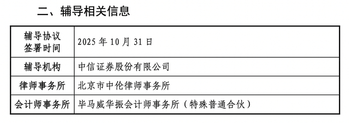 本次IPO的辅导机构为中信证券股份有限公司,律师事务所为北京市中伦律师事务所,会计师事务所为毕马威华振会计师事务所(特殊普通合伙)。