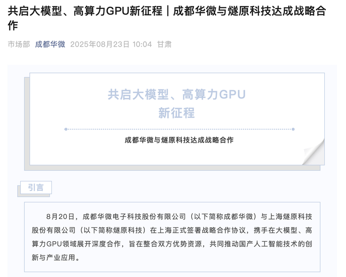 值得一提的是,今年8月,燧原科技与成都华微电子科技股份有限公司(以下简称“成都华微”) 正式签署战略合作协议。