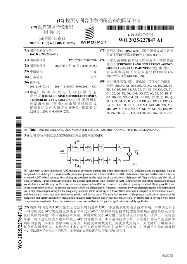 成都华微公布国际专利申请:“时间交织ADC失配校正方法及时间交织ADC”