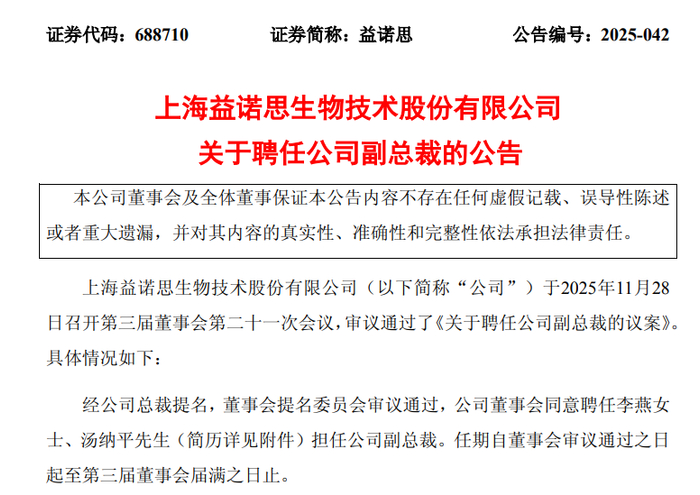 公告显示,上海益诺思生物技术股份有限公司当日召开第三届董事会第二十一次会议,审议通过《关于聘任公司副总裁的议案》,同意聘任李燕、汤纳平担任公司副总裁,任期自董事会审议通过之日起至第三届董事会届满之日止。