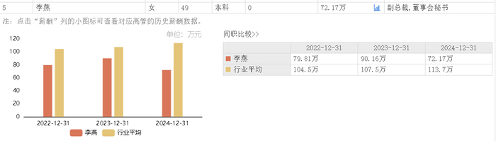据东方财富网数据,李燕2024年所获薪酬为72.17万元,相较上年薪酬90.16万元降薪19.95%。