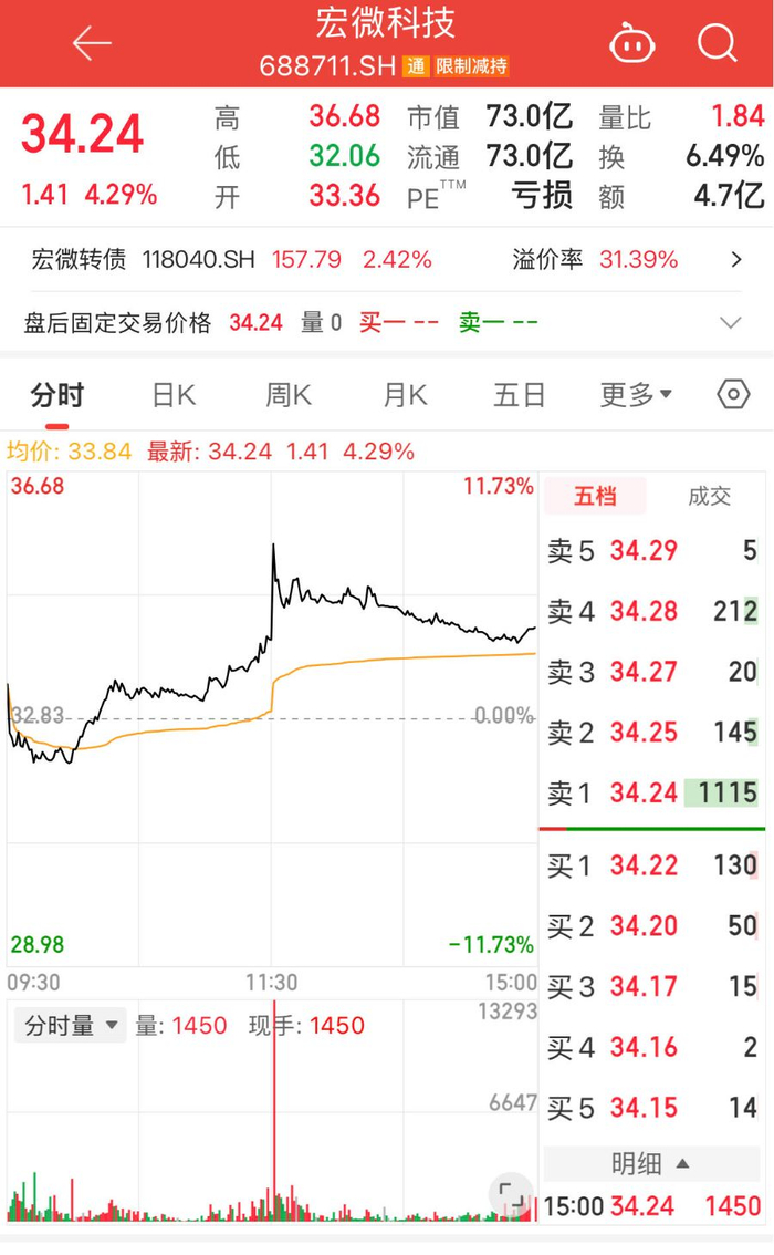 值得注意的是,当日午后,宏微科技股价快速放量拉升,涨幅一度超11%,随后震荡整理,截至收盘报34.24元/股,创下近一年新高,日内涨幅达4.29%。