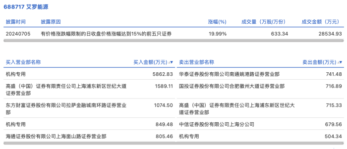 7月5日,艾罗能源今日涨停,龙虎榜数据显示,上榜营业部席位全天成交1.35亿元,占当日总成交金额比例为47.45%。其中,买入金额为1.02亿元,卖出金额为3357.6万元,合计净买入6823.77万元。