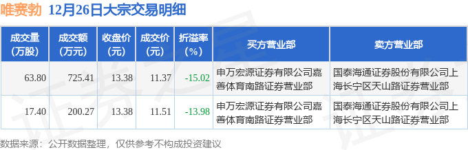 12月26日唯赛勃现1笔折价15.02%的大宗交易 合计成交925.68万元