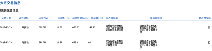 12月29日,唯赛勃大宗交易成交81.23万股,成交额939.02万元,占当日总成交额的34.61%,成交价11.56元,较市场收盘价13.29元折价13.02%。