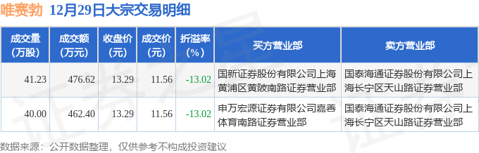 12月29日唯赛勃现2笔折价13.02%的大宗交易 合计成交939.02万元
