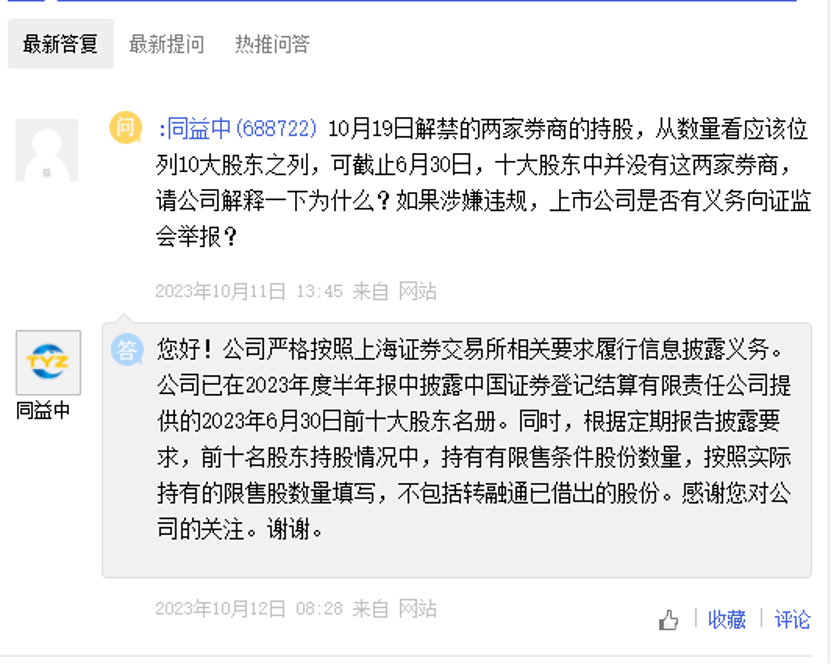 公告发布次日早间,A股集中竞价开始前,就有投资者在上证e互动追问公司——10月19日解禁的两家券商持股限售股,从数量看应该位列10大股东之列,可截止今年6月30日,十大股东中并没有这两家股东,请公司解释一下为什么?如果涉嫌违规,上市公司是否有义务向证监会举报?