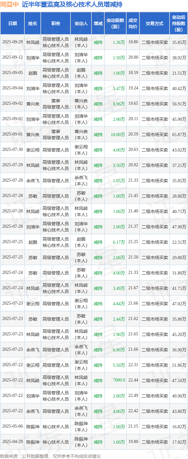同益中近半年内的董监高及核心技术人员增减持详情如下: