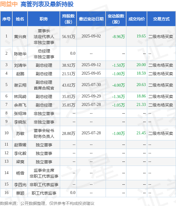 同益中的高管列表及最新持股情况如下: