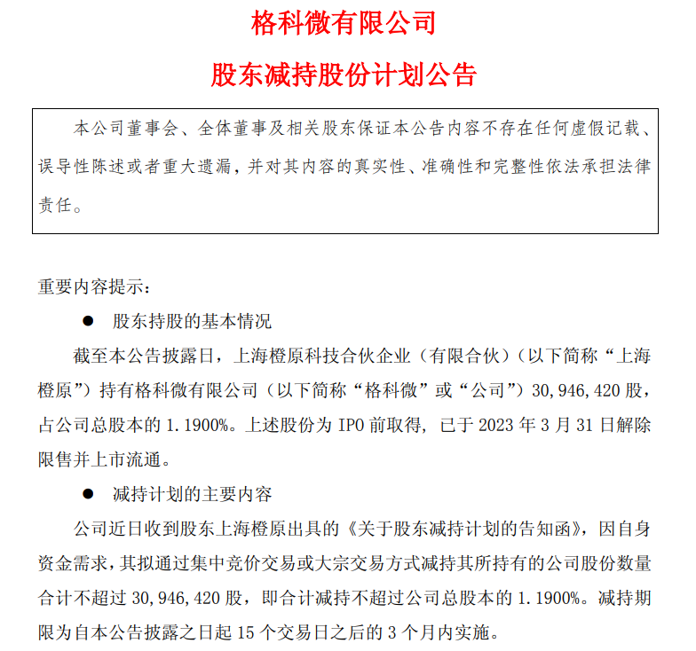11月3日,格科微(688728.SH)发布公告,公司近日收到股东上海橙原出具的《关于股东减持计划的告知函》,因自身资金需求,其拟通过集中竞价交易或大宗交易方式减持其所持有的公司股份数量合计不超过3094.64万股,即合计减持不超过公司总股本的1.19%。减持期限为自公告披露之日起15个交易日之后的3个月内实施。