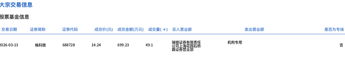 3月13日,格科微大宗交易成交119.55万股,成交额1702.39万元,占当日总成交额的6.07%,成交价14.24元,较市场收盘价14.24元持平。