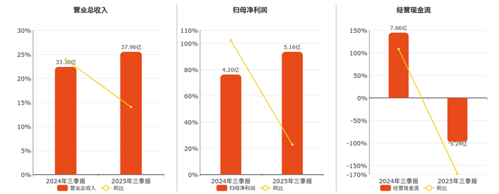公司营业总收入为37.96亿元,在已披露的同业公司中排名第18,较去年同报告期营业总收入增加4.67亿元,实现2年连续上涨,同比较去年同期上涨14.01%。归母净利润为5.16亿元,在已披露的同业公司中排名第21,较去年同报告期归母净利润增加9550.92万元,实现2年连续上涨,同比较去年同期上涨22.73%。经营活动现金净流入为-5.24亿元。