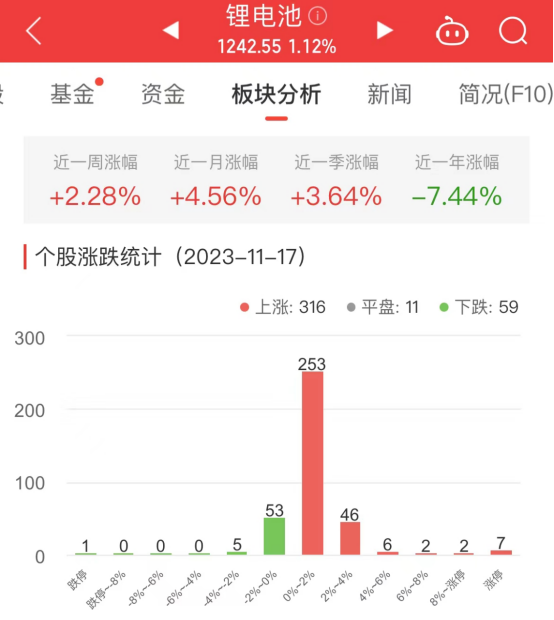 中国经济网北京11月17日讯今日,锂电池板块整体涨幅1.12%,其中316只股票上涨,11只股票平盘,59只股票下跌。