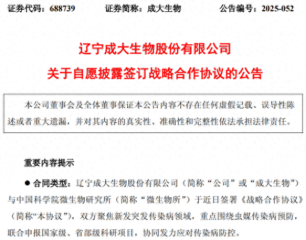 【环球网财经综合报道】10月22日,上市公司成大生物(688739.SH)发布公告称,与中国科学院微生物研究所签署《战略合作协议》。双方聚焦新发突发传染病领域,重点围绕虫媒传染病预防,联合申报国家级、省部级科研项目,协同发力应对传染病防控。