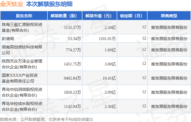 证券之星消息,根据市场公开信息整理,金天钛业(688750)于11月20日将有1.5亿股限售股份解禁,为公司首发原股东限售股份,占公司总股本32.36%。(本次数据根据历史公告整理得出,实际情况以上市公司最新公告为准)最近一年内,该股累计解禁582.97万股,占总股本的1.26%。本次解禁后,公司还有2.3亿股限售股份,占总股本49.64%。具体如下图所示: