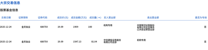 12月24日,金天钛业大宗交易成交181.04万股,成交额3456.13万元,占当日总成交额的15.1%,成交价19.09元,较市场收盘价19.24元折价0.78%。