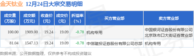 12月24日金天钛业现2笔大宗交易 机构净买入361.87万元