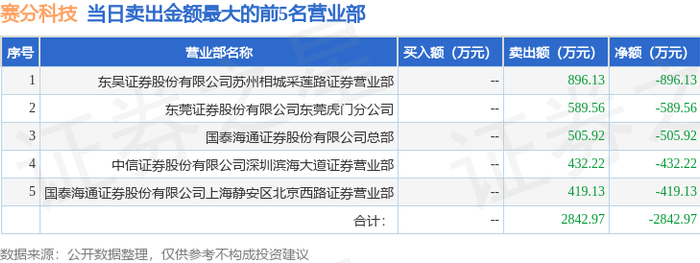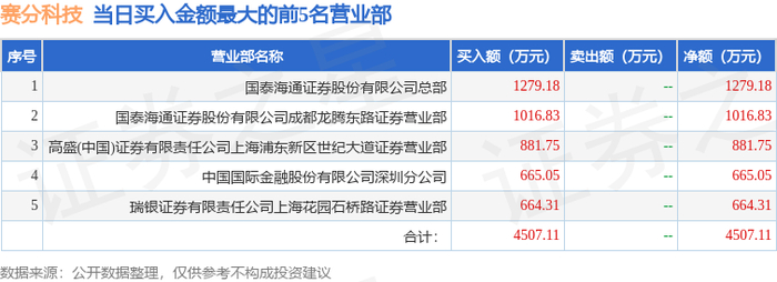 证券之星消息,沪深交易所2025年10月16日公布的交易公开信息显示,赛分科技(688758)因有价格涨跌幅限制的日换手率达到30%的前五只证券登上龙虎榜。此次是近5个交易日内第1次上榜。