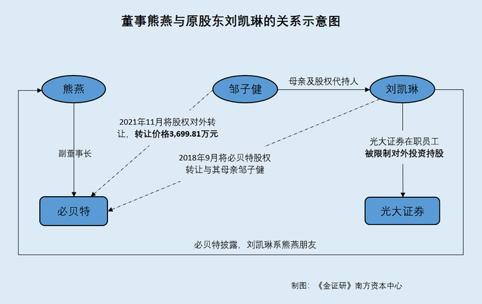 简言之,相关规定指出,证券从业人员应清廉自律,不得直接或间接谋取不正当利益。刘凯琳曾于2018年9月起通过其母名义持股必贝特,后在2021年11月退股。必贝特称刘凯琳系副董事长熊燕朋友,因其在证券公司任职被限制对外投资而委托其母代持。即刘凯琳隐名买卖必贝特股权,其与必贝特副董事长熊燕系朋友。
