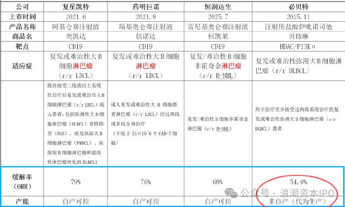 必贝特的唯一上市产品BEBT-908瞄准的r/rDLBCL(复发难治性弥漫大B细胞淋巴瘤)市场,可是已有6款竞品上市,包括CAR-T疗法(阿基仑赛、瑞基奥仑赛)和ADC药物(维博妥珠单抗)等。其中,阿基仑赛注射液、瑞基奥仑赛注射液、雷尼基奥仑赛注射液3个药物均为CAR-T疗法,而格菲妥单抗注射液为双特异性抗体药物,注射用替朗妥昔单抗则为抗体偶联药物,Selinexor与BEBT-908同为小分子靶向药物。但BEBT-908的ORR(客观缓解率)仅54.6%,显著低于第一梯队药物(ORR超68%)。