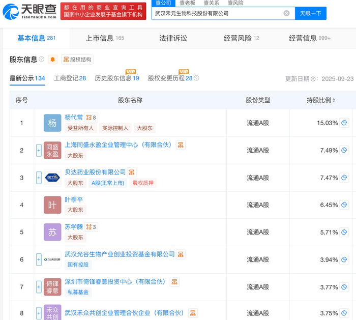 天眼查App信息显示,禾元生物成立于2006年11月。目前,该公司的注册资本为2.68亿元,法定代表人为杨代常,主要股东包括杨代常、贝达药业(SZ:300558)、光谷创投、倚锋资本等。