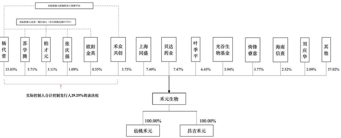 本次上市前,禾元生物的实际控制人为杨代常,其控制表决权比例为29.25%,为该公司董事长兼总经理。此外,贝达药业、杭州贝铭合计持有禾元生物9.02%的股份,海同盛及上海双良合计持股7.63%,叶季平持股6.45%,倚锋睿意及倚锋九期合计持股5.31%。