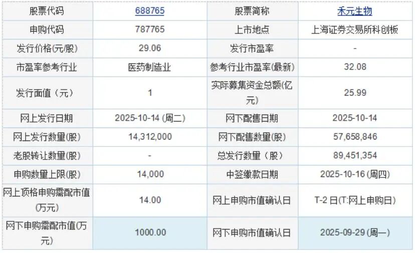 项乾消息:10月14日,禾元生物(688765.SH)开启申购,本次拟公开发行股票8945.14万股,其中网上发行1431.20万股,申购价格为29.06元/股 。当晚的中签结果显示,最终中签率0.0543%。
