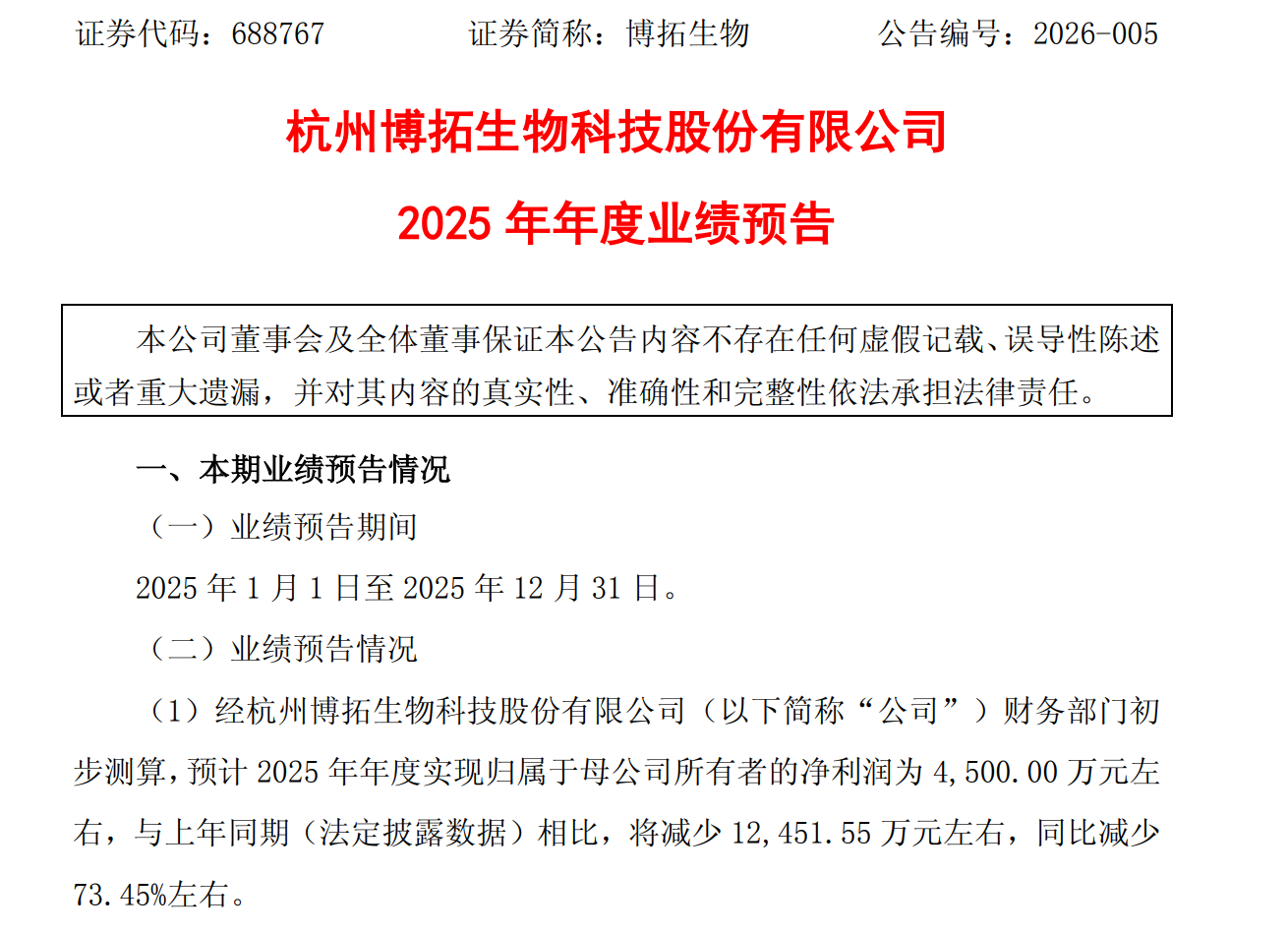 《科创板日报》1月23日讯(记者 史士云)今日晚间,博拓生物(688767.SH)发布 2025 年度业绩预告,经初步测算,公司预计 2025 年实现归母净利润约 4500 万元,较上年同期减少约 1.25 亿元,同比降幅 73.45%;扣非归母净利润约 2400 万元,较上年同期减少 约9528.76 万元,同比降幅 79.88%