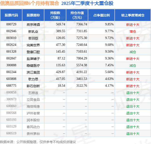 信澳品质回报6个月持有混合的前十大重仓股如下:
