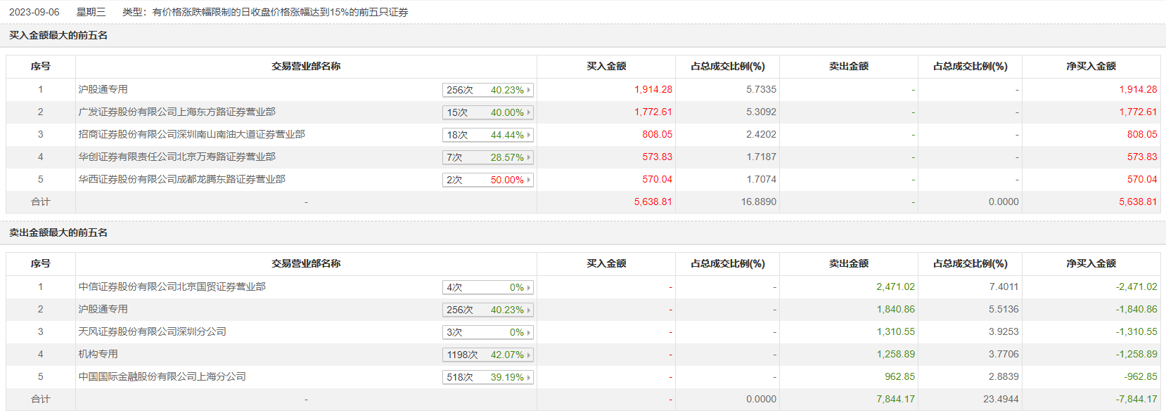 9月6日,国光电气今日涨18.87%,龙虎榜数据显示,上榜营业部席位全天成交1.35亿元,占当日总成交金额比例为40.38%。其中,买入金额为5638.81万元,卖出金额为7844.19万元,合计净卖出2205.38万元。
