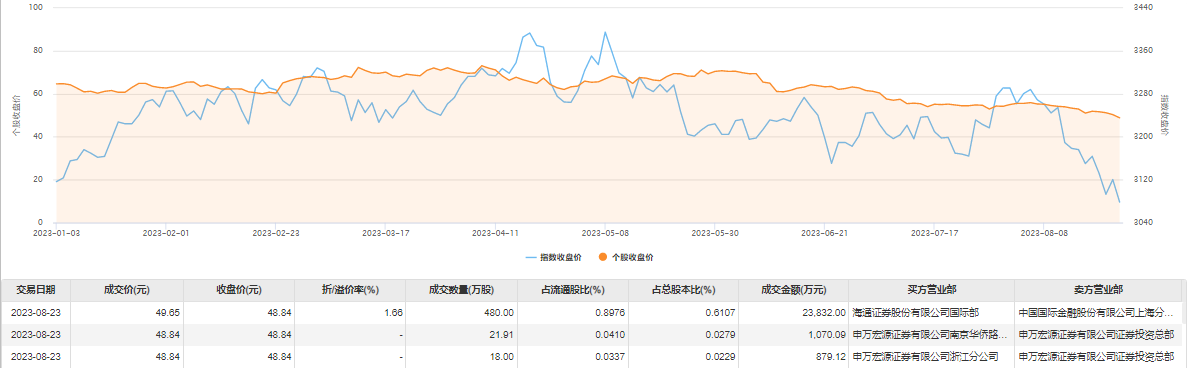 中控技术8月23日大宗交易成交519.91万股,成交额2.58亿元,占当日总成交额的39.32%,成交均价49.59元,较市场收盘价48.84元溢价1.54%,其中最高成交价49.65元,最低成交价48.84元。