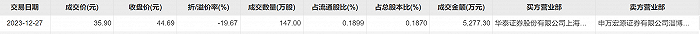 今日大宗交易成交147万股,成交额5277.3万元,占当日总成交额的15.57%,成交价35.9元,较市场收盘价折价19.67%。