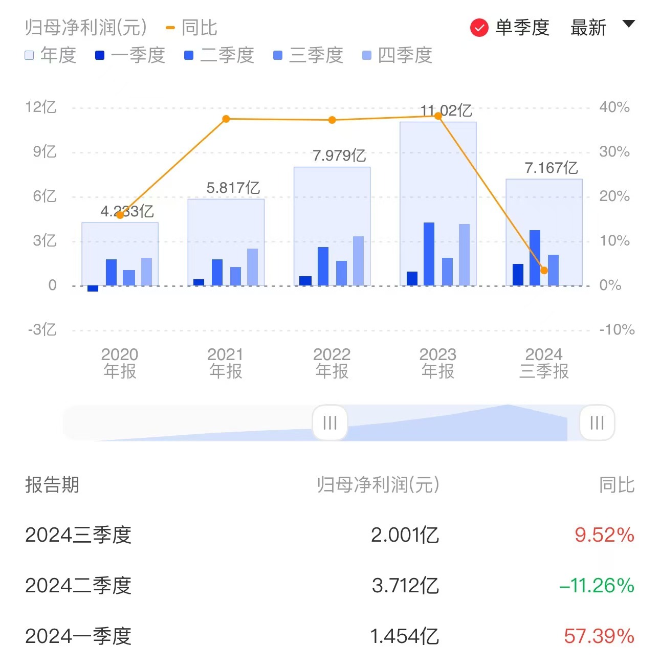 公告显示,前三季度实现营业收入63.37亿元,同比增长11.58%;归母净利润7.17亿元,同比增长3.36%。其中,第三季度实现营业收入20.85亿元,同比增长2.30%;归母净利润2.001亿元,同比增长9.52%,环比下降46.09%。