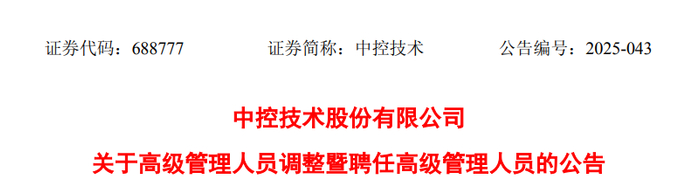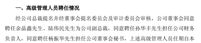 瑞财经 钟鸣辰 12月18日晚,中控技术(SH688777)发布多项人事变动公告,宣布聘任余晶鑫、陆伟民为副总裁,孙华丰担任财务负责人,杨振华任董事会秘书。