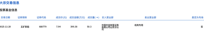 11月20日,五矿新能大宗交易成交50.3万股,成交额399.38万元,占当日总成交额的0.78%,成交价7.94元,较市场收盘价7.94元持平。