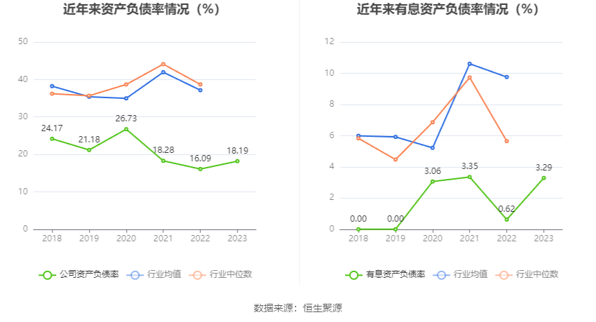 在偿债能力方面,公司2023年年末资产负债率为18.19%,相比上年末上升2.10个百分点;有息资产负债率为3.29%,相比上年末上升2.67个百分点。