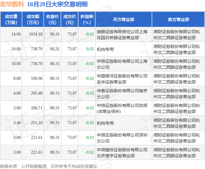 证券之星消息,10月20日宏华数科发生大宗交易,交易数据如下: