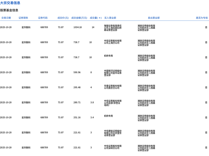 10月20日,宏华数科大宗交易成交59.2万股,成交额4373.11万元,占当日总成交额的27.23%,成交价73.87元,较市场收盘价80.31元折价8.02%。