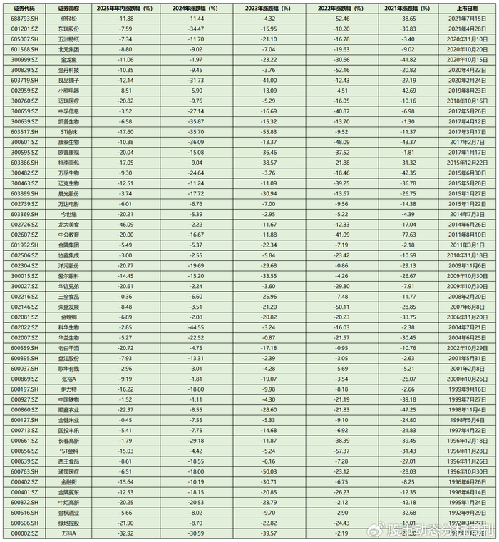 注:2025年统计截止日期为12月18日收盘,统计期内上市股票是以上市首日开盘价为基准计算当年度涨跌幅。