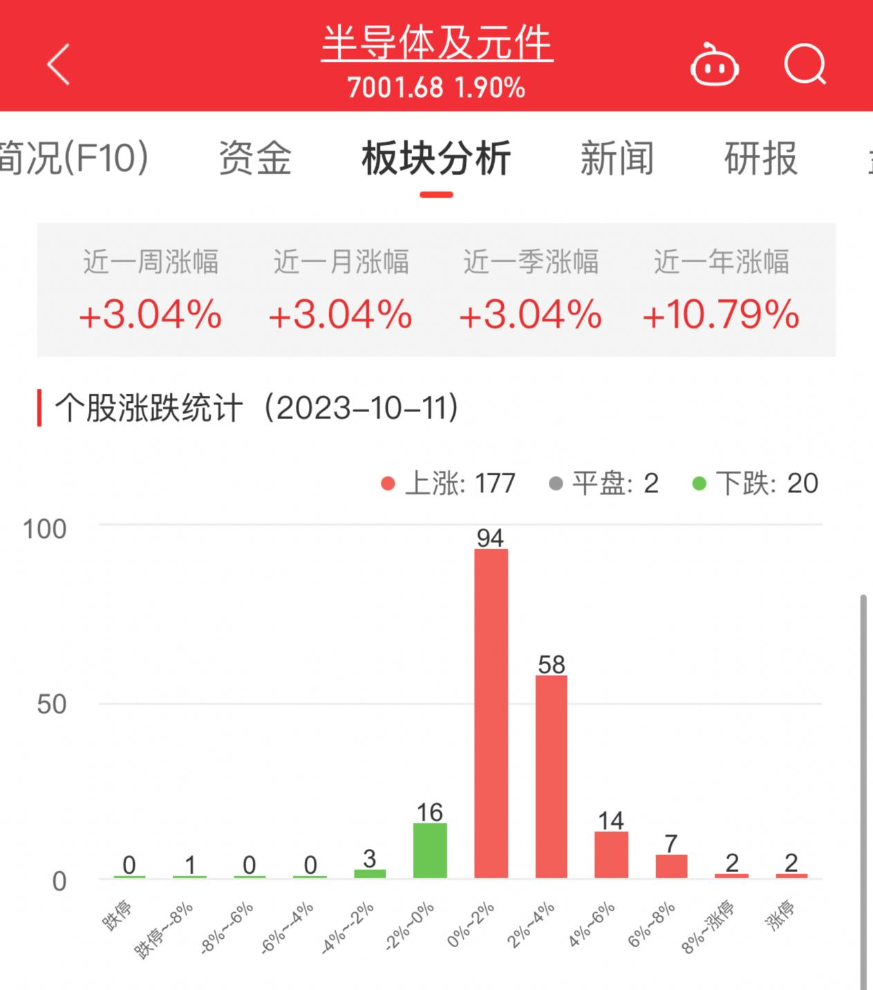 中国经济网北京10月11日讯 今日,半导体及元件板块整体涨幅1.90%,其中177只股票上涨,2只股票平盘,20只股票下跌。