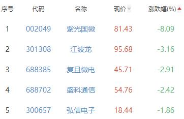 紫光国微、江波龙、复旦微电、盛科通信、弘信电子位列涨幅榜后五位,涨幅分别为-8.09%、-3.16%、-2.91%、-2.42%、-1.86%。