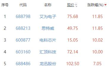 其中,艾为电子、思特威、电科芯片、汇顶科技、龙迅股份位列板块涨幅前五位,涨幅分别为11.85%、11.85%、10.02%、10.00%、7.05%。