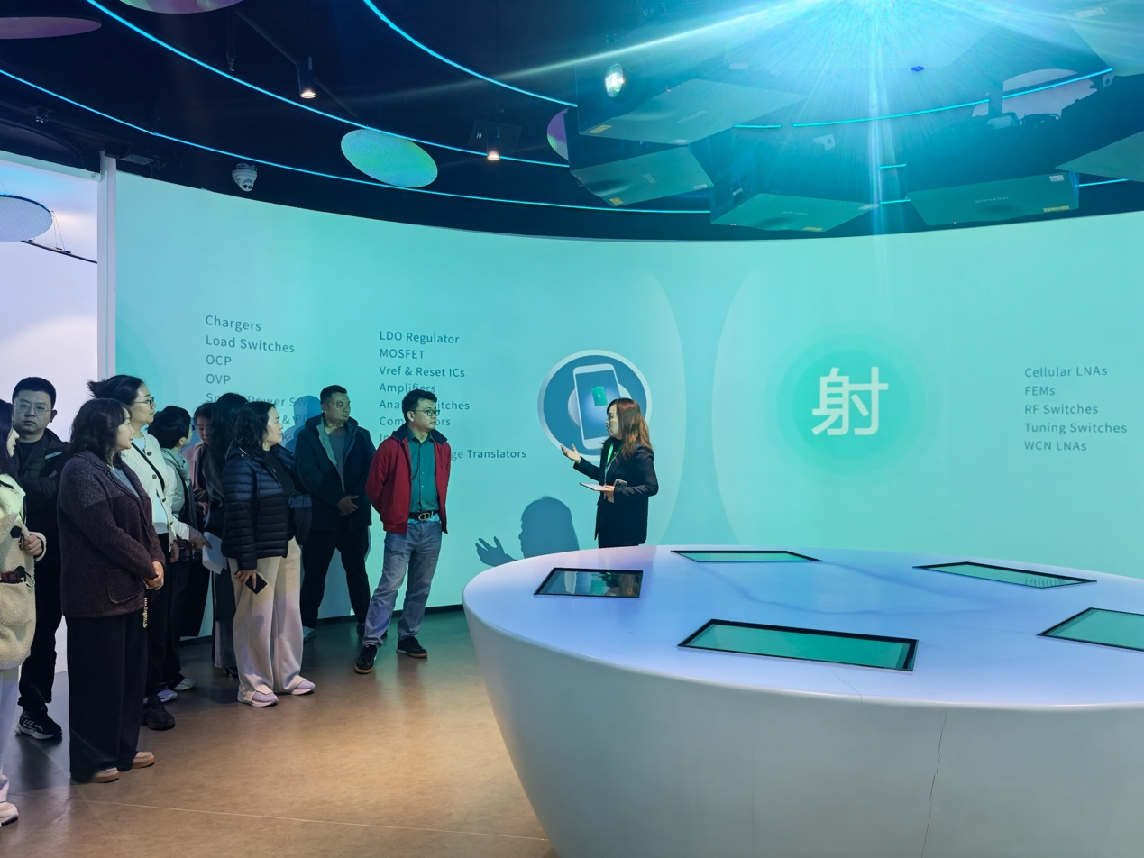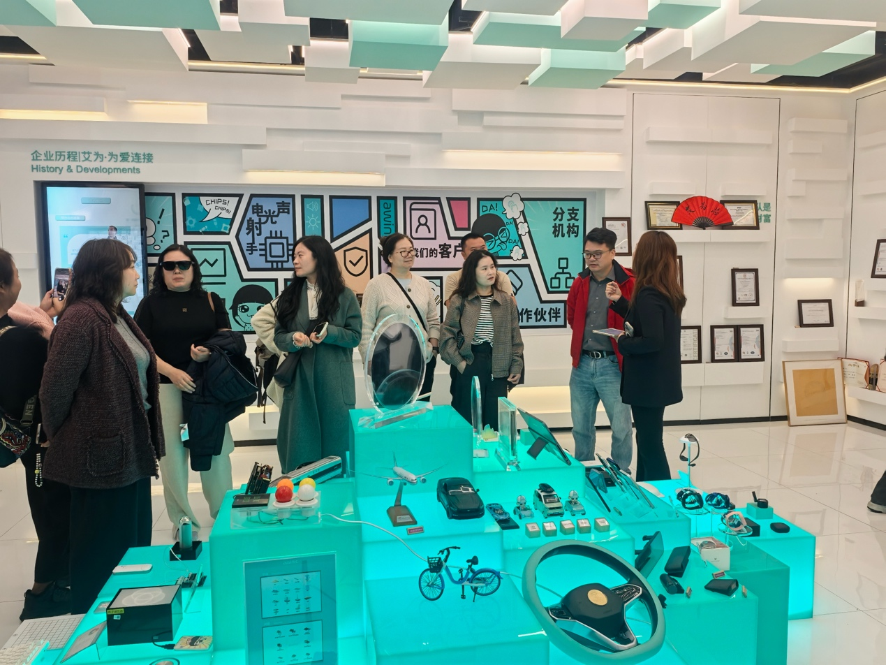 在正式交流前,参访投资者首先走进艾为电子企业展厅,从“声、光、电、射、手”五大领域的产品阵列与核心技术成果中,全面感受企业发展脉络与技术实力。
