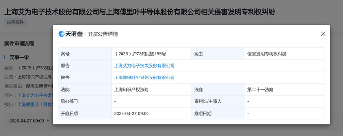 根据天眼查披露的开庭公告,案号为(2025)沪73知民初195号的侵害发明专利权纠纷一案,已定于2026年4月27日在上海知识产权法院正式开庭审理。